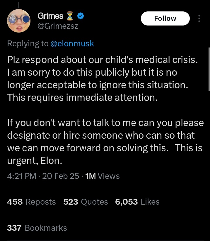 In a series of tweets on X (formerly Twitter), Grimes appealed for Elon Musk’s swift intervention amid their son’s medical crises.