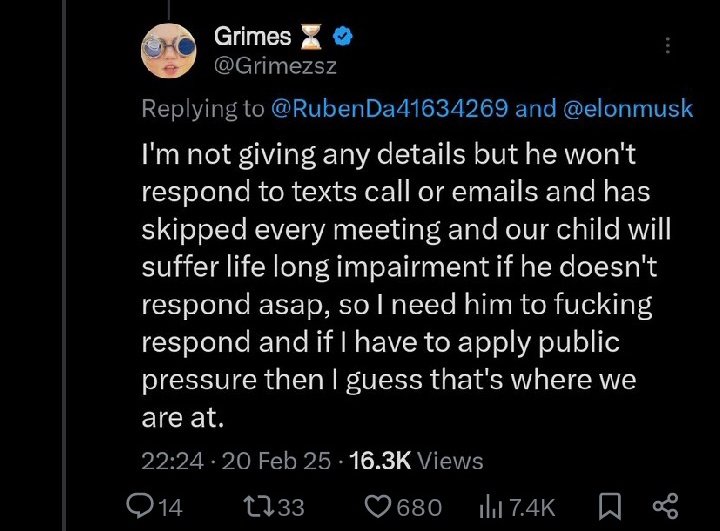 According to Grimes, she has made multiple attempts to contact Elon Musk via phone calls and emails, even scheduling meetings, but he has shown unresponsiveness