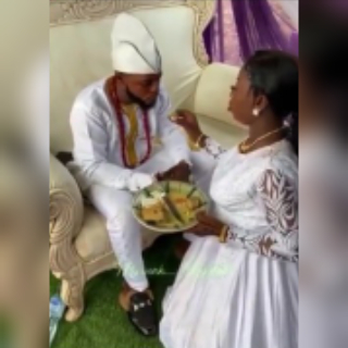 In the video shared online, the heavily pregnant bride who looked unhappy knelt before her newly-wedded husband to feed him slices of cake as part of the marital rite.