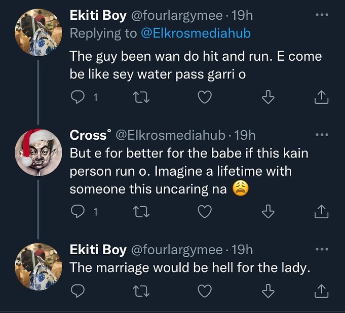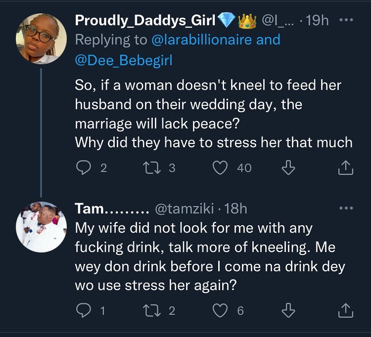 Twitter users have criticized a groom for allowing his heavily pregnant bride to kneel to feed him at their wedding, IgbereTV reports.