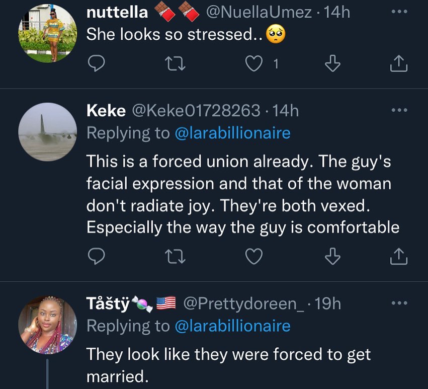 The couple’s demeanor at the wedding also pushed some social media users into believing it is a “forged marriage”.