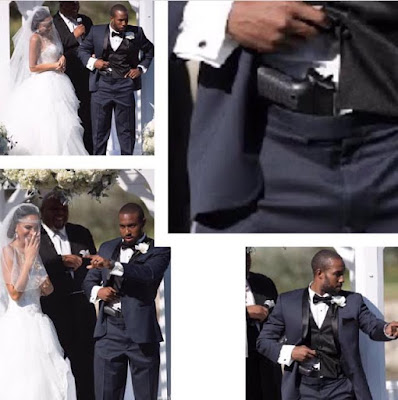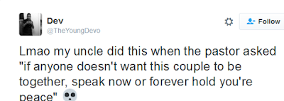 This has gone viral on twitter, with over 91,000 retweets and 130,000 likes. According to the person who shared the photos, @TheYoungDevo, his uncle flashed a gun when the pastor officiating his wedding asked guests “if anyone doesn’t want this couple to be together, speak now or forever hold you’re peace.” Lol.