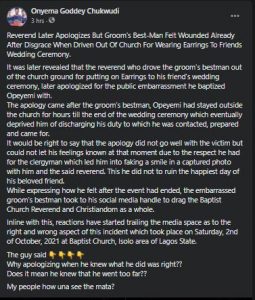 It was later revealed that the reverend who drove the groom’s bestman out of the church ground for putting on Earrings to his friend’s wedding ceremony, later apologized for the public embarrassment he baptized Opeyemi with.
