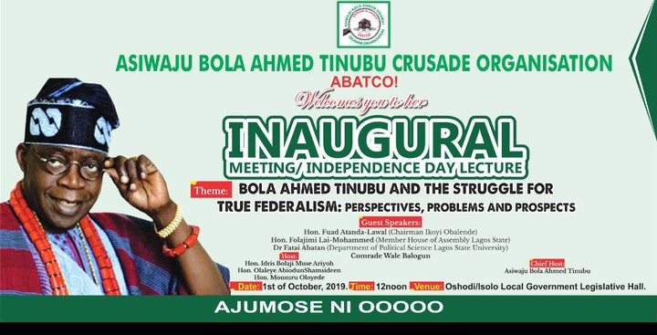 The National Convener of Asiwaju Bola Ahmed Tinubu Crusade Organization (ABATCO), Comrade Ayeni Oluwaseun Samuel clarified in a statement in Lagos that the programme for the day is aimed at holding a public lecture to discuss on the struggle for True Federalism; Perspectives, Problems, and Prospects.