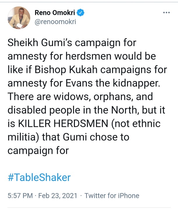 Sheikh Gumi’s campaign for amnesty for herdsmen would be like if Bishop Kukah campaigns for amnesty for Evans the kidnapper. There are widows, orphans, and disabled people in the North, but it is KILLER HERDSMEN (not ethnic militia) that Gumi chose to campaign for