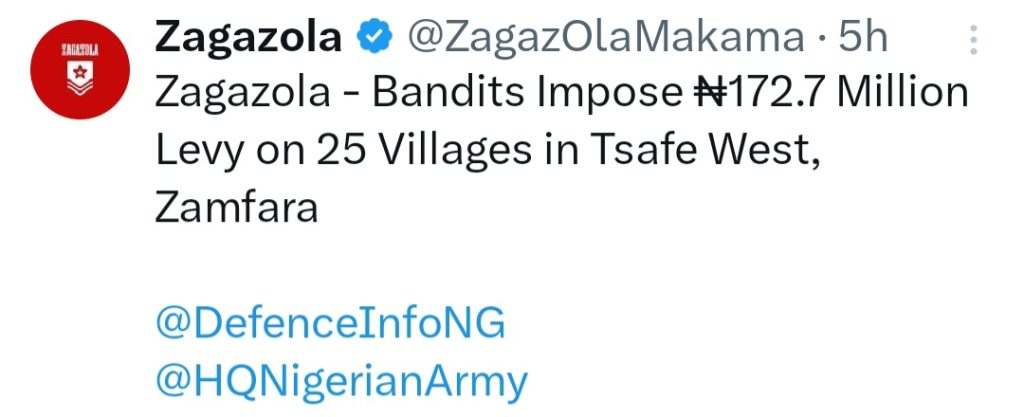 The security analyst in a breakdown of the levies for each village wrote: The targeted villages and their respective levies include:Gijinzama: ₦8.5M, Dakolo: ₦5M + 20 bags of soybeans, Gunja: ₦7M, Kauyen Kane: ₦5M, Kurar Mota: ₦6M, Sabon Garin Bakin Gulbi: ₦2.5M, Kibari: ₦3M, Karda: ₦5M, Daga Ciki: ₦3M, Biya: ₦5M, Barebari: ₦6M, Kauyen Magaji: ₦7M, Kwaren Maisaje: ₦10M, Magazawa: ₦10M, Maciya: ₦5M, Unguwar Danhalima: ₦5M, Unguwar Rogo: ₦5M, Katanga: ₦5M, Magazu: ₦5M, Sungawa: ₦15M, Rakyabu: ₦15M, Yalwa: ₦2.7M, Tsageru: ₦5M, Gidan Anne: ₦7M, Kunchin Kalgo: ₦20M