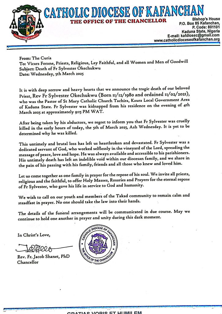 Gunmen suspected to be bandits have kidnapped and killed Rev. Fr. Sylvester Okechukwu, the parish priest of St. Mary Catholic Church, Tachira in Kaura Local Government Area of Kaduna State.
