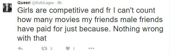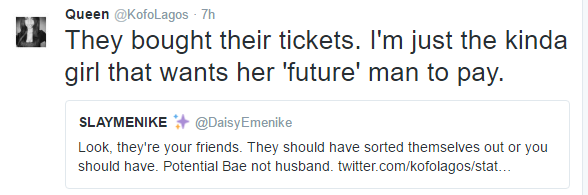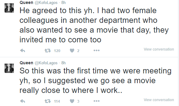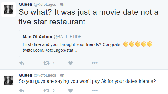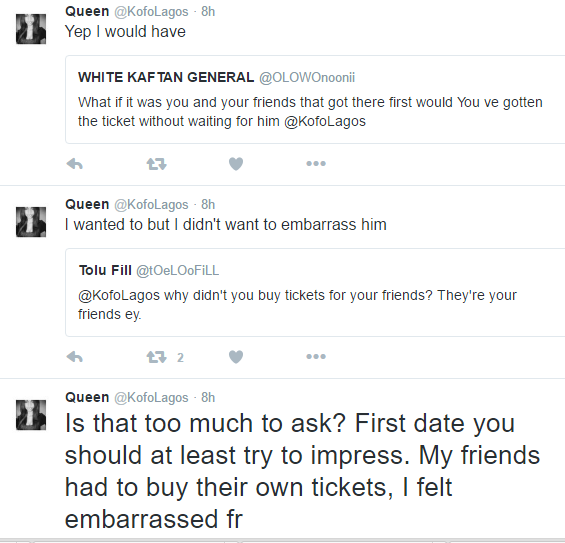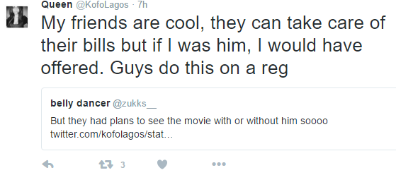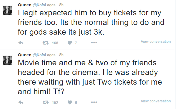 Twitter user @KofoLagos yesterday shared this story about the time she got really pissed off cos a guy asked her out to a movie date, she agreed and invited her friends over for the date as well. Only for the guy to embarrass her by refusing to pay for her friends’ movie tickets.