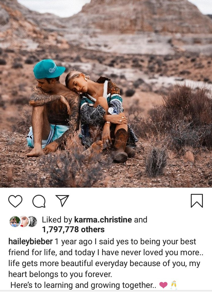 Sharing a photo of them together, Hailey wrote: “1 year ago I said yes to being your best friend for life. And today I have never loved you more.. life gets more beautiful everyday because of you, my heart belongs to you forever. Here’s to learning and growing together..”