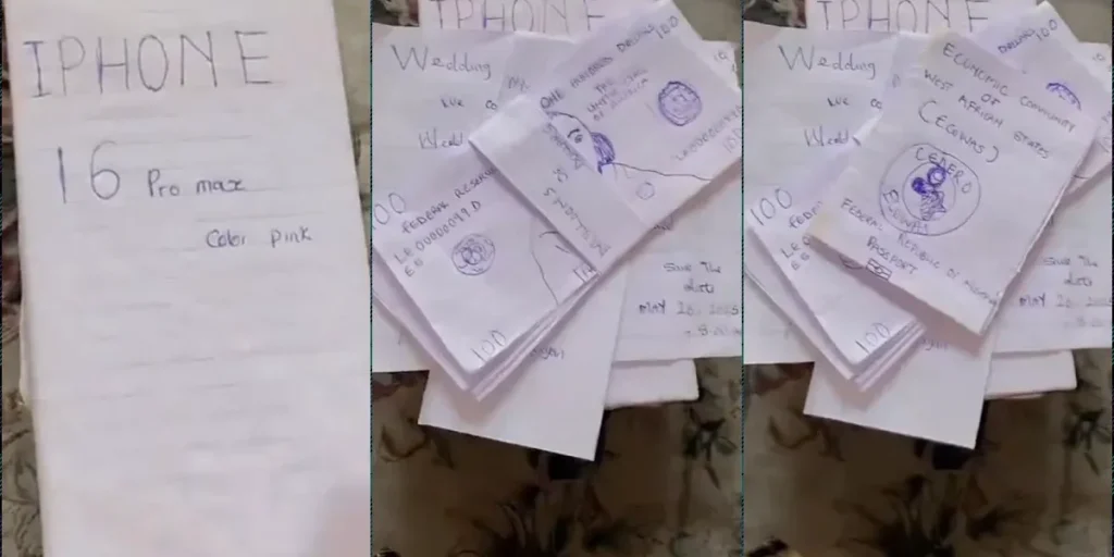 In a viral TikTok video shared by @olaayo013, the lady showcased handmade paper replicas of items she wanted from God, including an iPhone 16, a wedding invitation, cash, a traveling passport, a naming ceremony invite, and others.