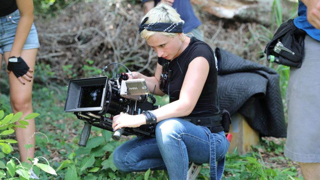 The 42-year-old cinematographer can be seen dressed in a beanie with headphones on and her back to the camera, while Baldwin can be seen in costume.