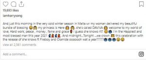 And just this morning in the very cold winter season in Malta 🇲🇹 my woman delivered my beautiful bundle of blessing 😀🙌 my princess is Here 👸 🙌. she’s called DAVIVA 👸 welcome to my world of love, Hard work, peace , money , fame and grace 🌹 I guess she knows rit? 😊🤷🏿♂️ I’m the Happiest and most blessed man this year 2021 🕺💃🕺💃. And midnight…Tonight …we crown 👑 this celebration with the release of she knows ft Fireboy and Olamide ooooooh wat a year?????🤷🏿♂️🤷🏿♂️🤷🏿♂️😀😀
