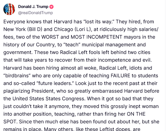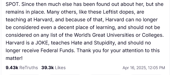 “Harvard is a JOKE, teaches Hate and Stupidity, and should no longer receive Federal Funds.”