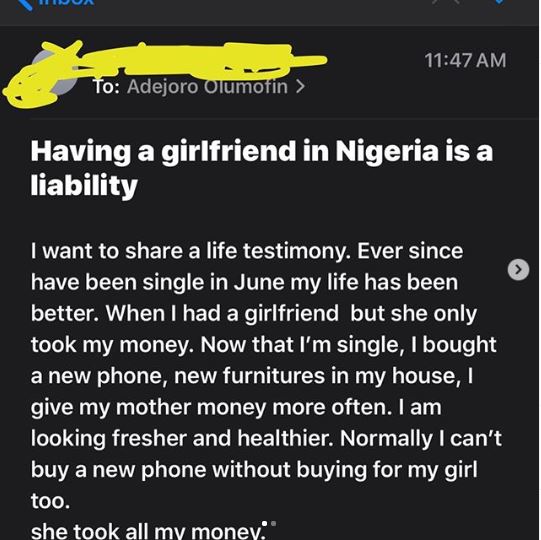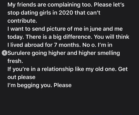 This man who is based in the Surulere area of Lagos State has complained about how ladies milk their boyfriends in relationships.