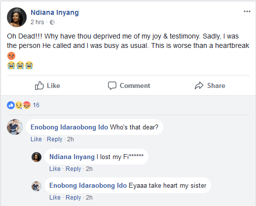 She wrote on Facebook; “Oh Dead!!! Why have thou deprived me of my joy & testimony. Sadly, I was the person He called and I was busy as usual. This is worse than a heartbreak”