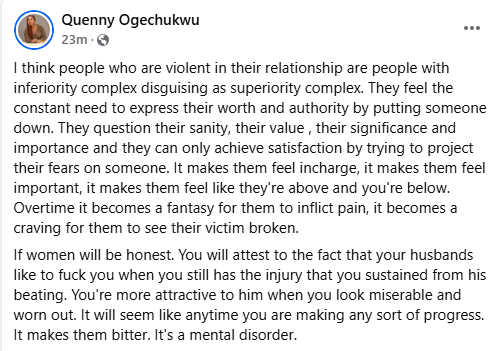 “I think people who are violent in their relationship are people with inferiority complex disguising as superiority complex. They feel the constant need to express their worth and authority by putting someone down,” she wrote.
