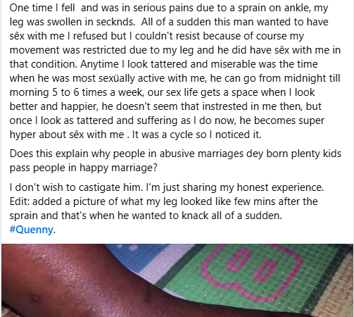 One time I fell and was in serious pains due to a sprain on ankle, my leg was swollen in seconds. All of a sudden this man wanted to have sêx with me I refused but I couldn’t resist because of course my movement was restricted due to my leg and he did have sêx with me in that condition.
