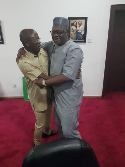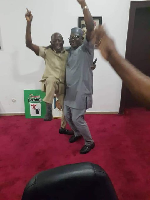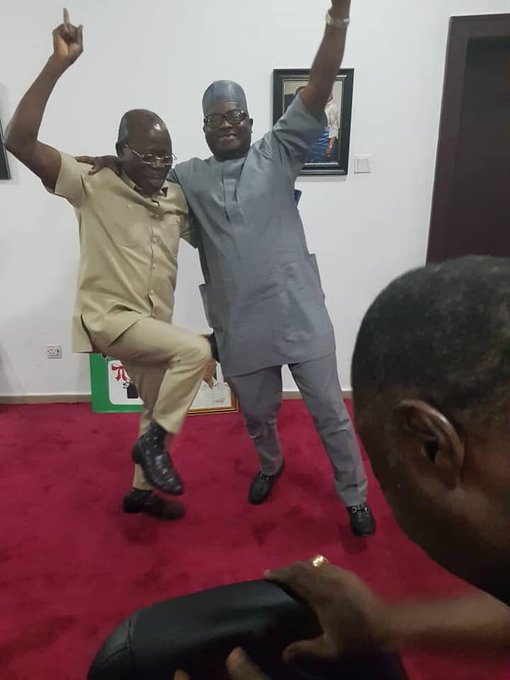 APC chairman Adams Oshiomhole and the party’s Spokesman, Lanre Issa onailu celebrating Buhari’s victory .