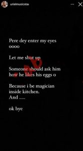 “Pere dey enter my eyes ooooLet me shut upSomeone should ask him how he likes his eggs oBecause I be magician inside kitchen. And……ok bye”