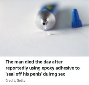 A MAN had died after using super strong glue “to seal off his penis” in a drug-fuelled romp with his girlfriend as they’d forgotten to bring a condom.