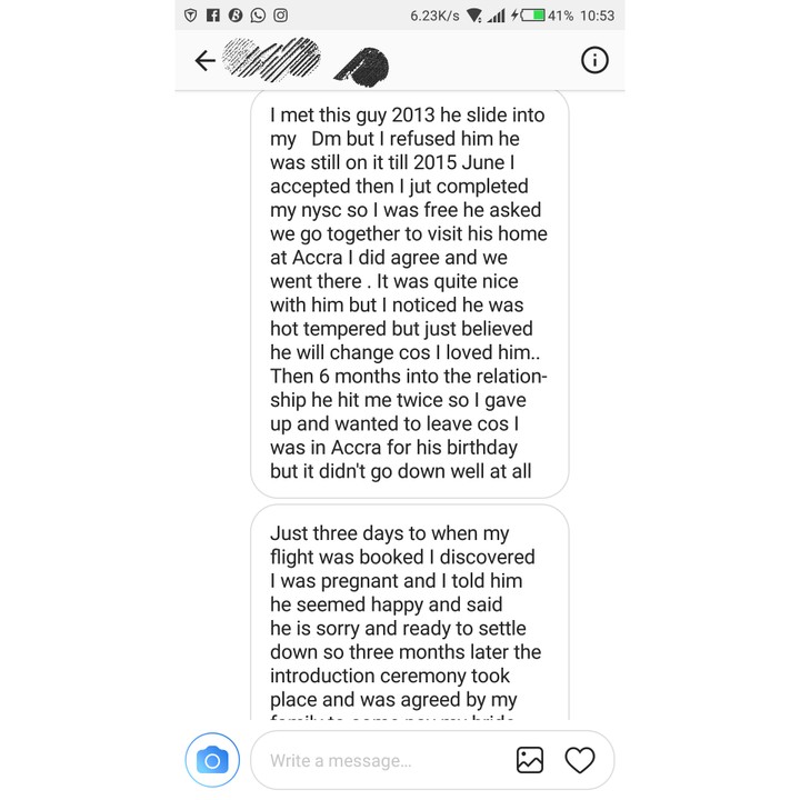 I met this guy in 2013, he slid into my DM but I refused him. He was still on till 2015 June, I accepted. Then I just completed my NYSC so I was free. He asked we go together to visit him home at Accra, I did agree and we went there. It was quite nice with him but I noticed he was hot tempered but just believed he will change because I loved him. Then 6 months into the relationship he hit me twice so I gave up and wanted to leave cos I was in Accra for his birthday and it didn’t go well at all.