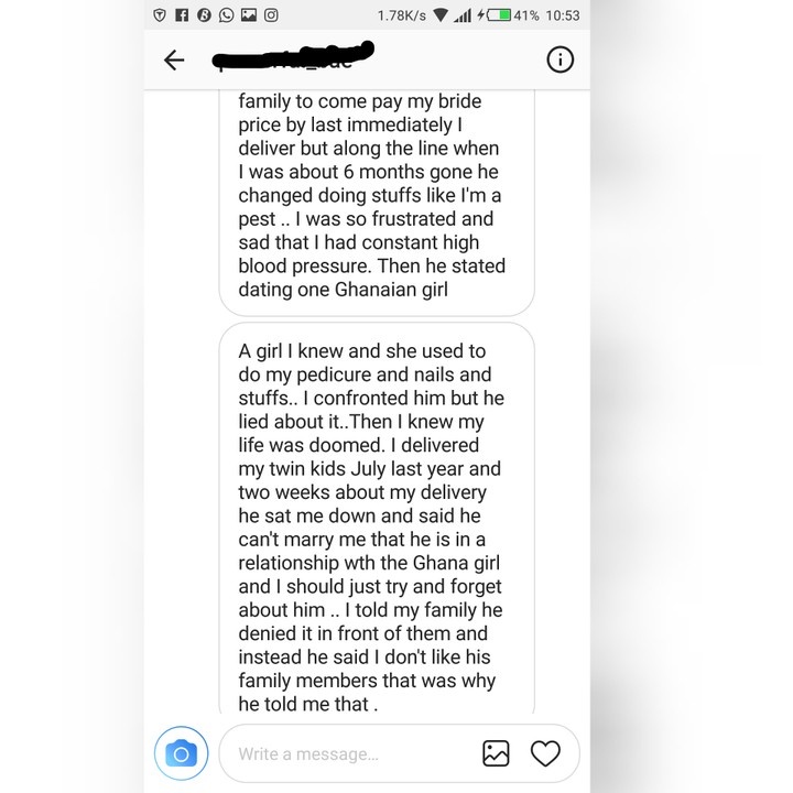 A girl I knew and she used to do my pedicure and nails and stuff…I confronted him but he lied about it. Then I knew my life was doomed. I delivered my twin kids July last year and two weeks about my delivery, he sat me down and said he can’t marry me that he is a in a relationship with the Ghana girl and I should just try to forget about him… I told my family, he denied in front of them and instead he said I don’t like his family members, that’s why he told me that.