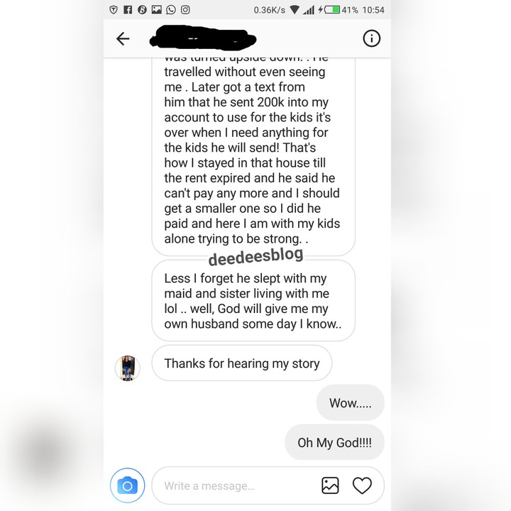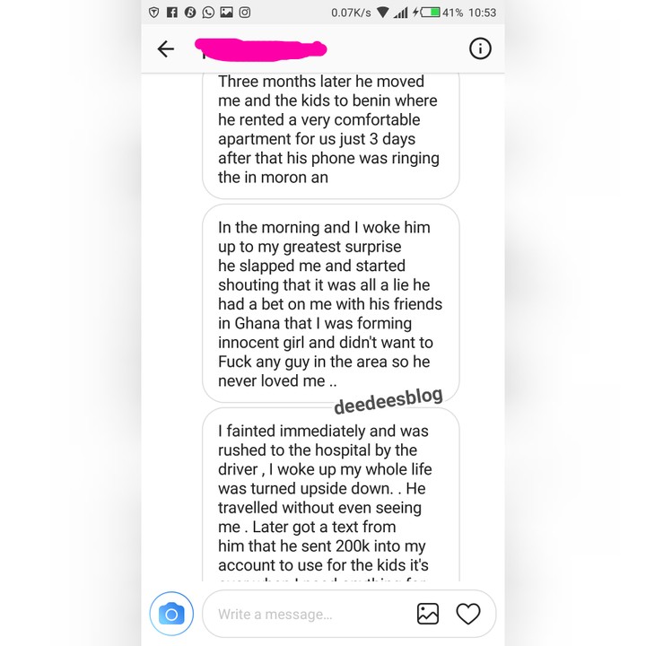 I fainted immediately and was rushed to the hospital by the driver. I woke up my whole life was turned upside down. He traveled without even seeing me. Later got a text from him that he sent 200k into my account to use for kids it’s over. When I need anything for the kids he will send. That was how I stayed in the house with the kids till the rent expired and he said he can’t pay anymore and I should get a smaller one, so I did he paid and here I am alone with my kids trying to stay strong.