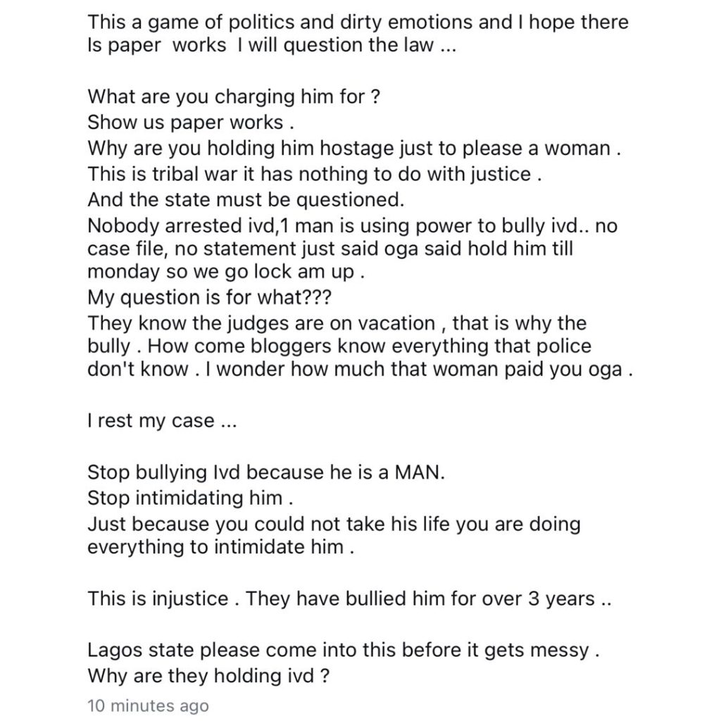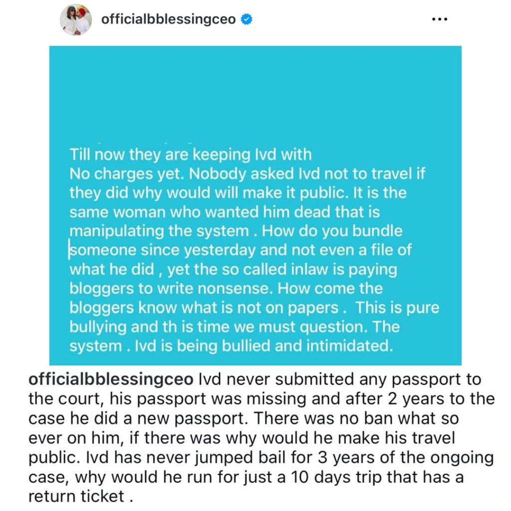 In a statement released on her Instagram page this afternoon, Blessing argued that IVD is being bullied and intimidated. She said that there was no court directive banning him from travelling as he would never have even made his travel plans public if there was.