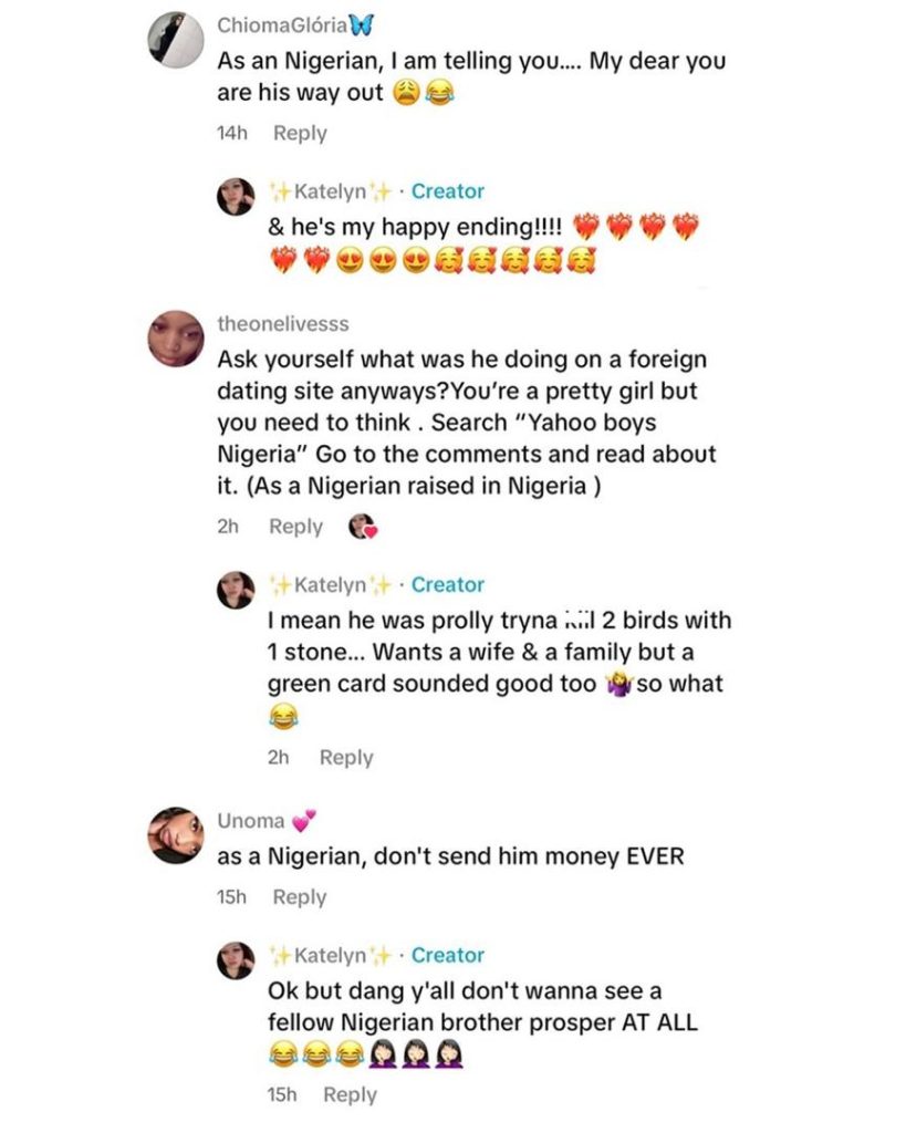 However, some Nigerians stormed her page to ask her to be weary of the man claiming that he doesn’t love her and is just using her to secure a green card.