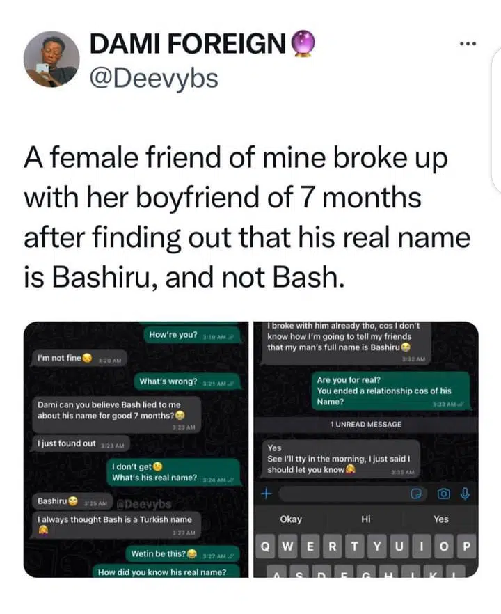 “A female friend of mine broke up with her boyfriend of 7 months after finding out his real name is Bashiru, and not Bash“, the tweet read.