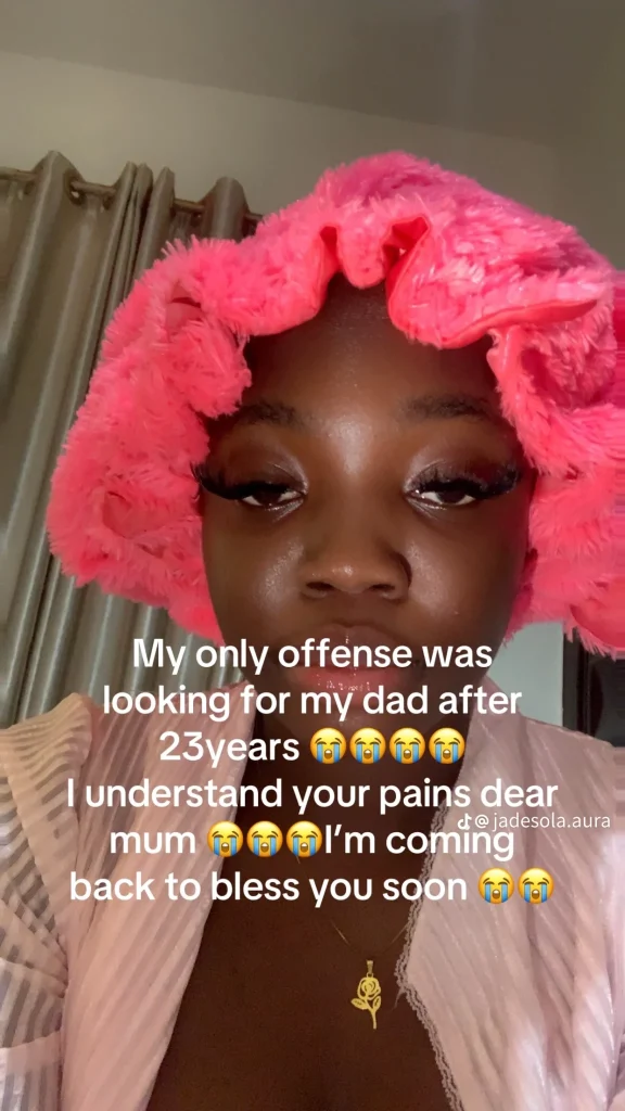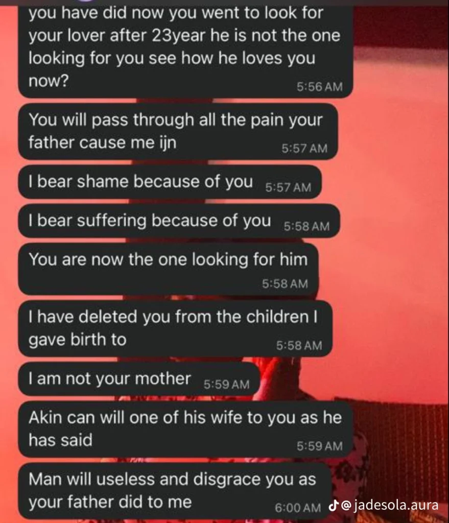 The lady, @jadesola_aura on TikTok, shared a screenshot capturing her mother’s unexpected response to finding her absent father.