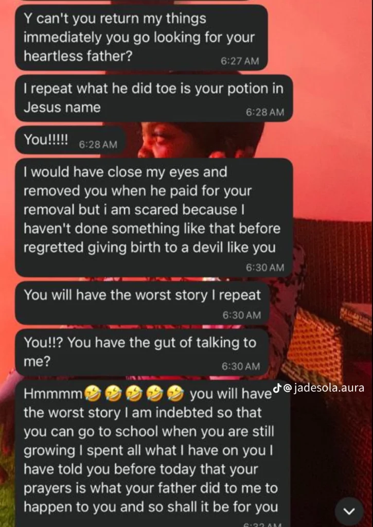 ”I’m indebted so that you can go to school. When you are still growing, I spent all what I’ve on you. I have told you. before today that your prayers is what your father did to me to happen to you and so shall it be for you”, The chat reads.