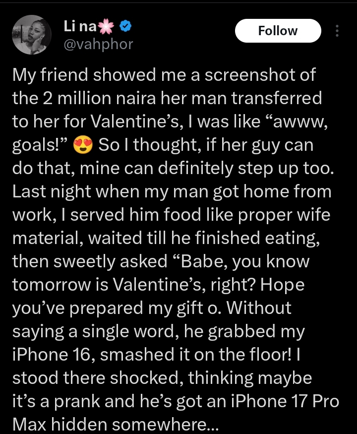 Last night when my man got home from work, I served him food like proper wife material, waited till he finished eating, then sweetly asked “Babe, you know tomorrow is Valentine’s, right? Hope you’ve prepared my gift o. Without saying a single word, he grabbed my iPhone 16, smashed it on the floor! I stood there shocked, thinking maybe it’s a prank and he’s got an iPhone 17 Pro Max hidden somewhere.