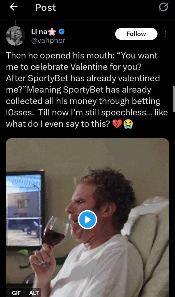 However, her boyfriend informed her that he had lost his money to betting, stating, “You want me to celebrate Valentine’s for you? After SportyBet has already Valentined me?”.