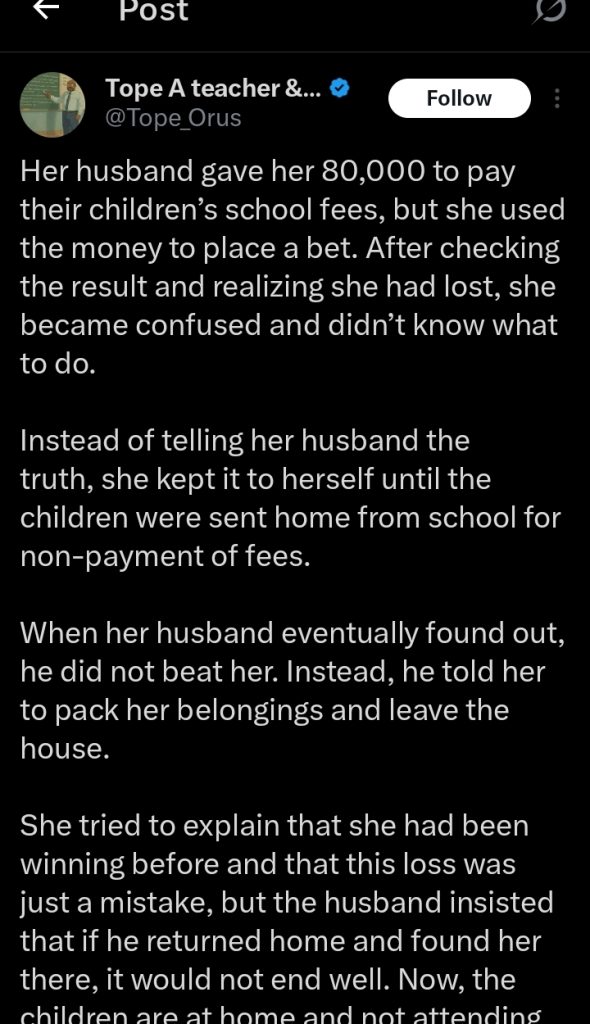 According to the X user, the woman’s husband handed over N80,000 to her for payment of their children’s school fees, which she used for betting.
