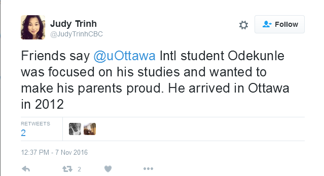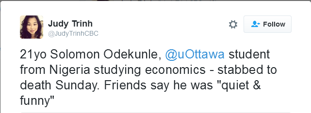 Late Odekunle, who arrived Canada in 2012 was until his tragic death, an Economics student of University of Ottawa. Judy Trinth, a reporter with CBCNews spoke to the victim’s friends yesterday, a day after he was stabbed to death near the corner of St. Laurent Blvd. and Oglive Rd.