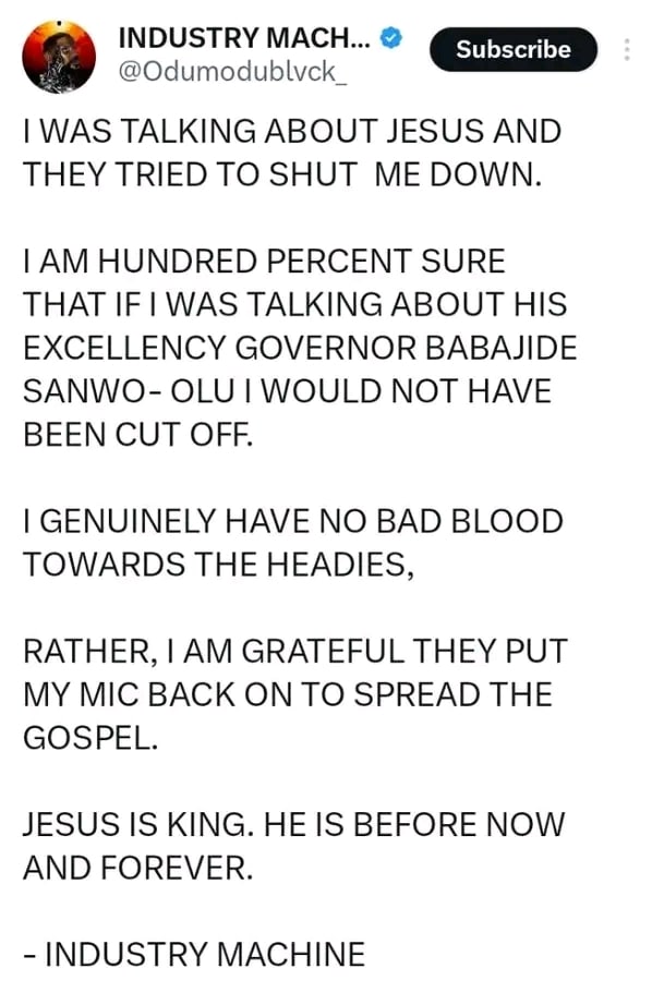 His tweet reads,“I WAS TALKING ABOUT JESUS AND THEY TRIED TO SHUT ME DOWN. I AM HUNDRED PERCENT SURE THAT IF I WAS TALKING ABOUT HIS EXCELLENCY GOVERNOR BABAJIDE SANWO- OLU I WOULD NOT HAVE BEEN CUT OFF.