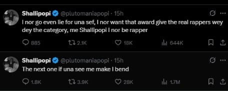 “I nor go even lie for una sef, I nor want that award. Give the real rappers wey dey the category. Me, Shallipopi I nor be rapper.”