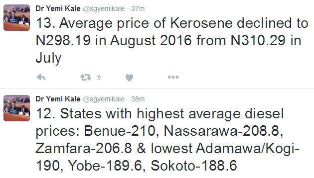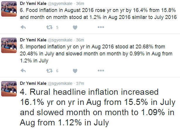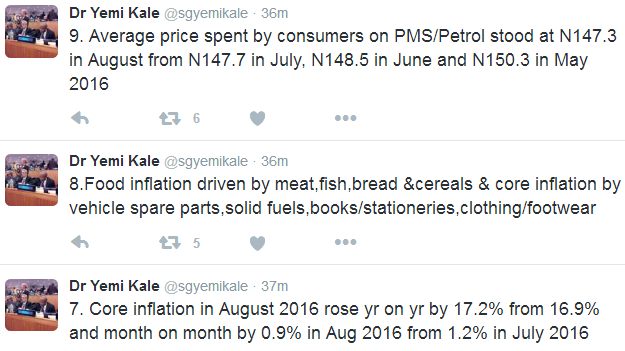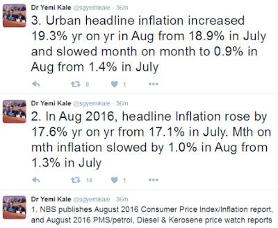 Two weeks after it released a report stating that the economy was indeed in recession, the Statistician General of Nigeria and CEO of the Nigerian National Bureau of Statistics, Yemi Kale, has released the August 2016 CPI/inflation, PMS, Diesel and Kerosene price watch reports. According to the report, in the month of August, headline Inflation rose by 17.6% yr on yr from 17.1% in July. Read more after the cut..