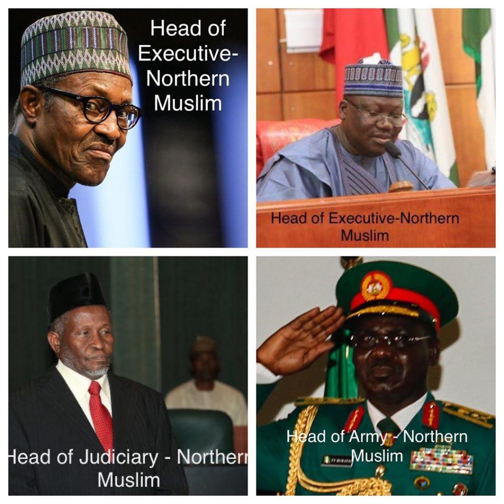 “The heads of the Executive, Legislature and Judiciary are all Northern Muslim men, as are the heads of the Nigerian Army, NPF, NSA, DSS, NIA, DMI, DIA, NPS, NCS, NIS, and EFCC.