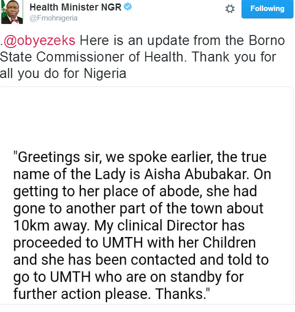 Yesterday twitter user, @ibrahimu14, called on the Minister of Health, Isaac Adewole, to help an elderly Internally Displaced Woman who appears to be a cancer patient. Former Minister of Education, Oby Ezekwesili, took it up and urged the Minister to act promptly which he did.