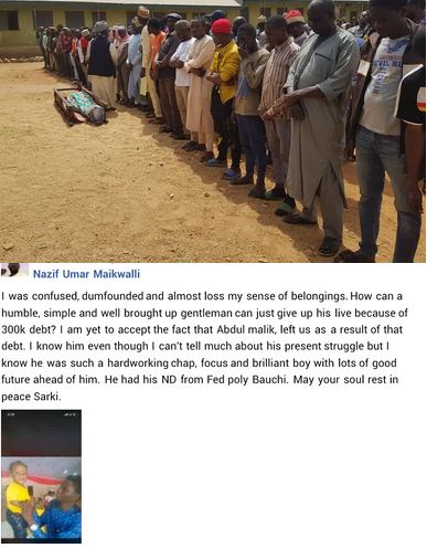 “I was confused, dumbfounded and almost lost my sense of belongings. How can a humble, simple and well brought up gentleman just give up his life because of 300k debt? I am yet to accept the fact that Abdul malik, left us as a result of that debt. I know him even though I can’t tell much about his present struggle but I know he was such a hardworking chap, focus and brilliant boy with lots of good future ahead of him. He had his ND from Fed poly Bauchi. May your soul rest in peace Sarki.” he wrote.