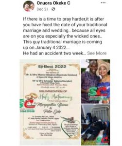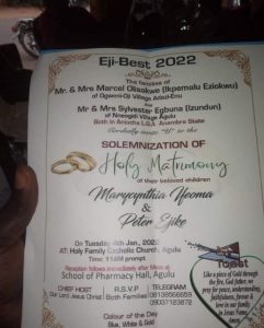 Ejike and Marycynthia’s wedding was set to hold at Holy Family Catholic Church in Agulu, Anambra State on Tuesday, January 4, 2022.