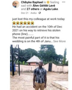 According to his colleague, Ejike got involved in a motor accident on December 10, while on the way to retrieve his stolen SIM card.