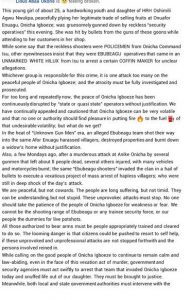 “This young girl of about 25, a hardworking youth and daughter of HRH Oshimili Agwu Nwukpa, peacefully plying her legitimate trade of selling fruits at Onuafor Enuagu, Onicha Igboeze; was gruesomely gunned down by reckless “security operatives” this evening. She was hit by bullets from the guns of these goons while attending to her customers in her shop.