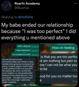 The heartbroken man identified as @RoarfxA on the micro-blogging platform, shared his conversation with the girlfriend who ended their relationship because he was too perfect.