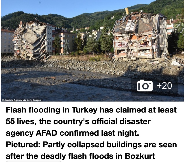 The death toll in Turkey’s devastating flash floods has now climbed to 55 victims with hundreds more missing – as the country battles disaster on two fronts after eight more people died in a fire-fighting aircraft crash.