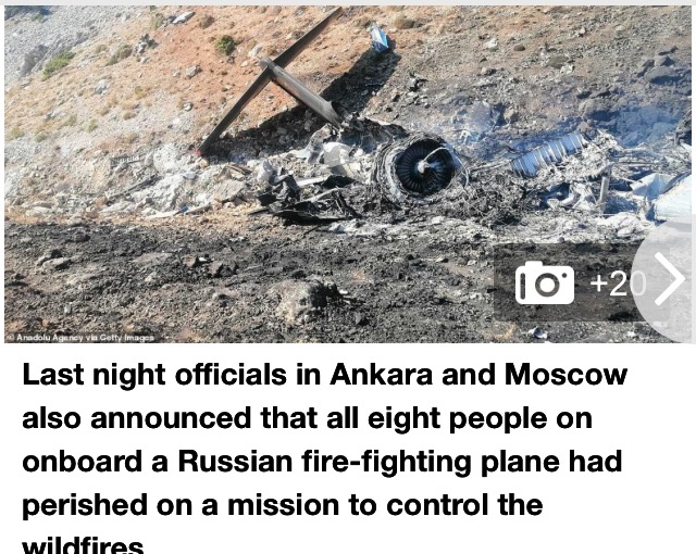 Last night officials in Ankara and Moscow also announced that all eight people on onboard a Russian fire-fighting plane had perished on a mission to control the wildfires.