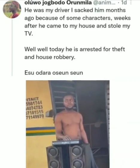 The herbalist went on Twitter to thank the devil after his former driver was arrested for theft.