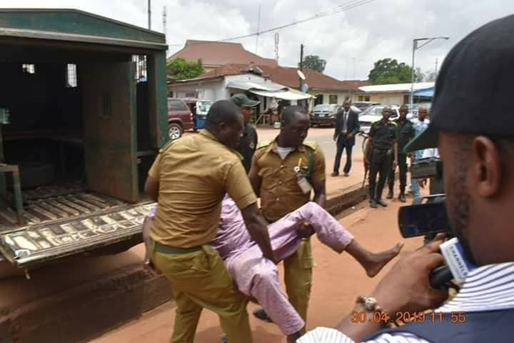 The four accused persons were brought to High Court 4, venue of their trial at exactly 10:05am with the 2nd defendant, Ojokojo Robinson Obajero, the 63 years old herbalist who allegedly used the deceased body parts to prepare money ritual concoctions for Onoriode Enaike and the others including one Kelvin (now deceased), could not come down from the prison vehicle. He is suspected to be suffering from stroke.